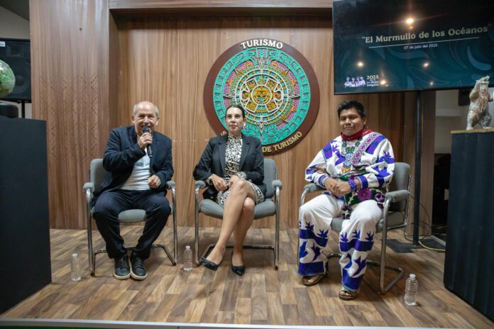 La secretaria de Turismo del Gobierno de México, Josefina Rodríguez Zamora; el fundador y CEO de Menchaca Studio, César Menchaca; y el artesano wixárika Idelfonso López Carrillo, en representación de las y los artesanos, inauguraron la exposición El Murmullo de los Océanos en el espacio Punto México de la Secretaría de Turismo (Sectur).